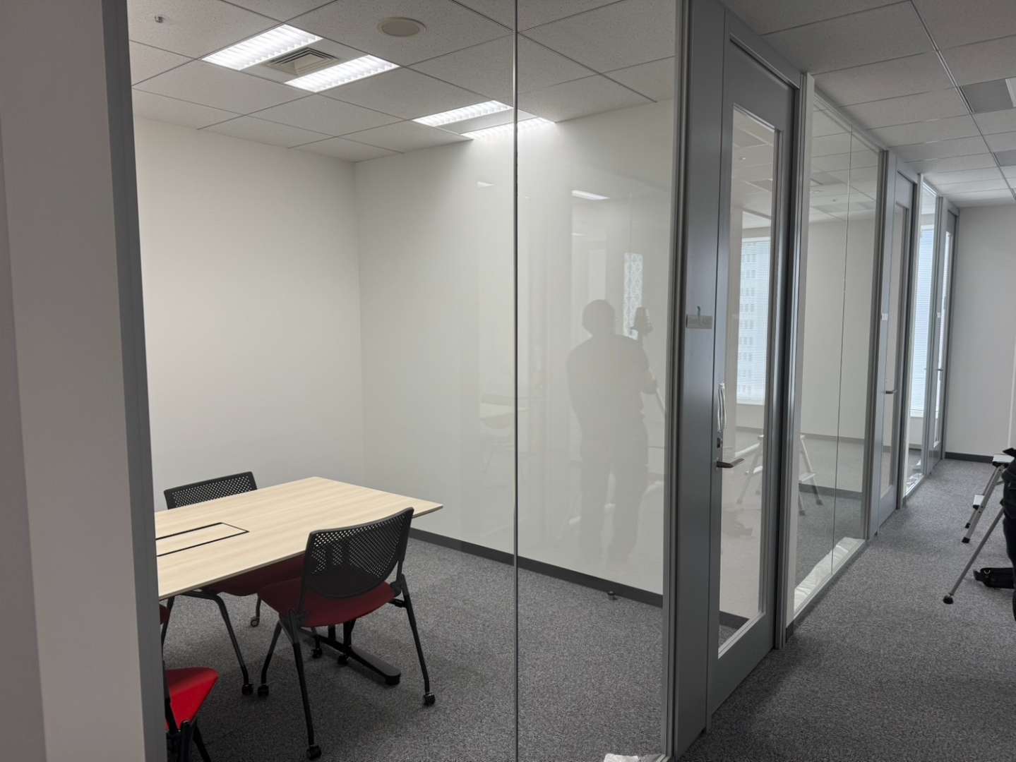 会議室は全面ガラス張りで開放感がある反面、