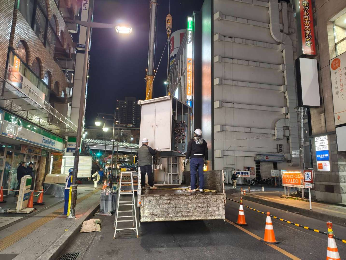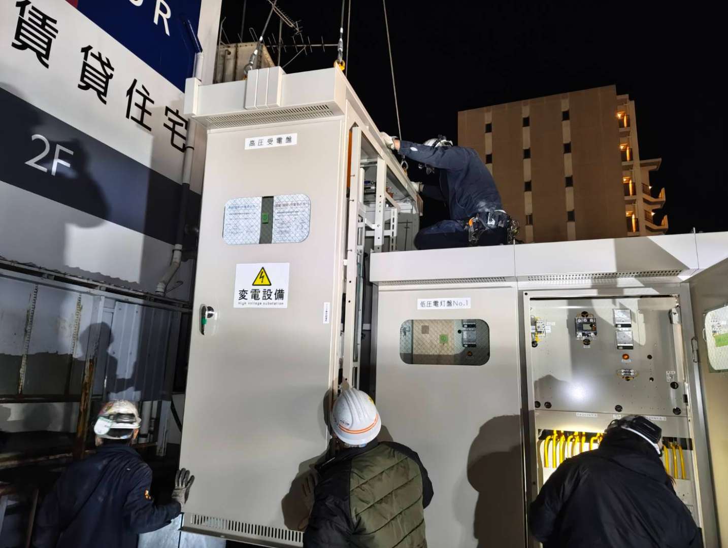 新しいキュービクルをクレーンで屋上まで吊り上げます。